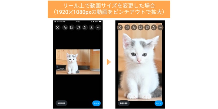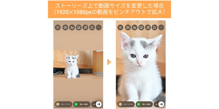 ストーリーズ・リールでは、上記以外のサイズの動画を投稿し、ピンチイン・ピンチアウトで見た目を調整することが可能です。しかし、元の動画サイズによってはぼやける場合があります。そのため、動画をきれいに表示させたい場合は、画像加工ツールなどでリサイズした動画を投稿するのがオススメです。