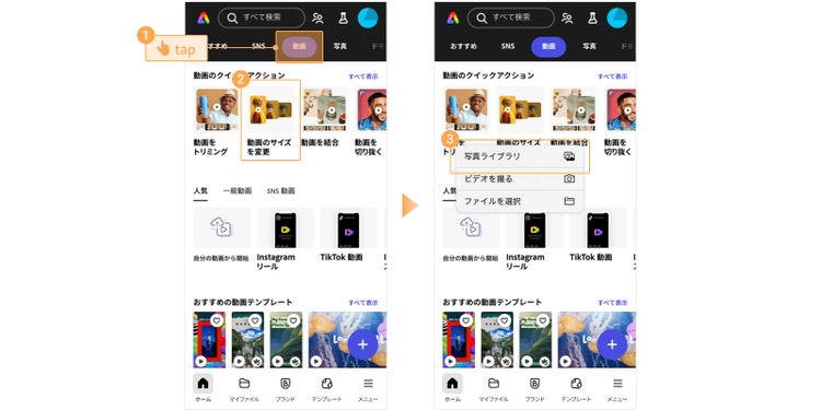 ホーム画面の「動画」タブをタップし、クイックアクション「動画のサイズを変更」を選択します。