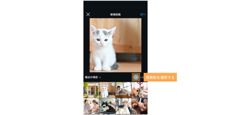 また、2ページ目以降で選ぶ動画や画像のサイズは、1ページ目の動画・画像の表示サイズに合わせて自動で変更される点にも注意しましょう。例えば、1ページ目に正方形の画像を扉絵として選んだ場合、2ページ目以降で縦長の動画を投稿しようとしても、自動的に正方形にトリミングされます。