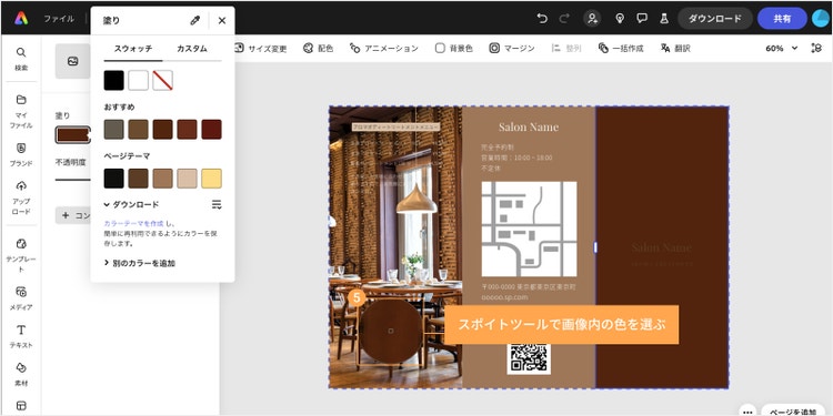 表示されているパレットから色を選んだり、スポイトツールで画像内の色を取ったりして、お好みの色になるように調整しましょう。 今回はスポイトツールで画像内の色を選んでみました。