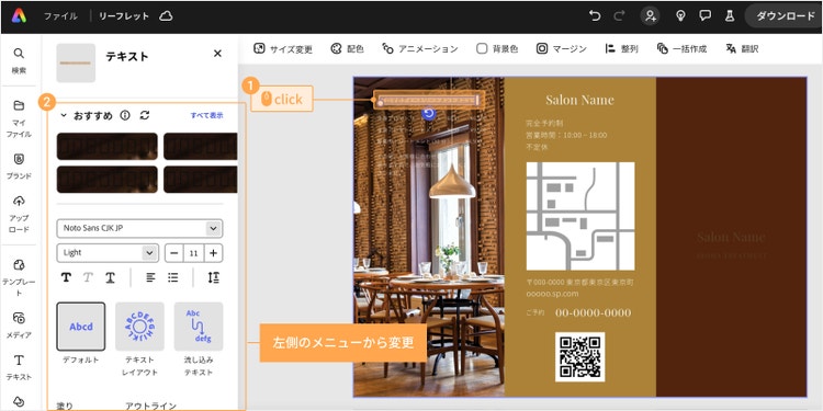 用意していたテキストをテンプレートに反映しましょう。 テキストボックスを選択すると、テキストを書き換えられます。 画面左側のメニューからは、文字のフォントやサイズ、色を変更できます。