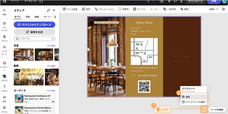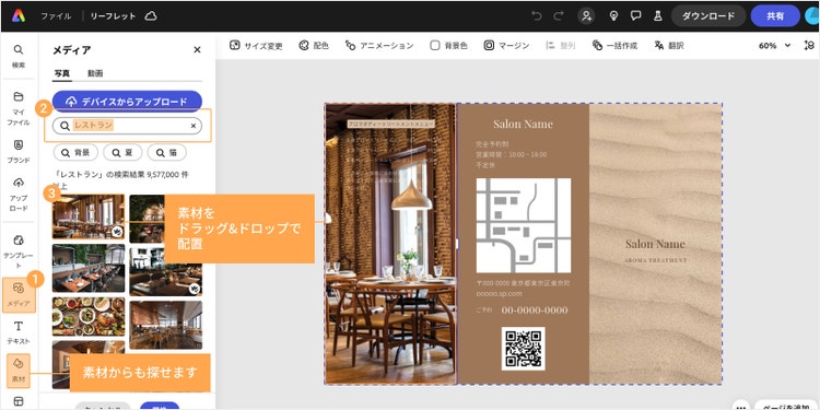 Adobe Stockにある素材を背景画像として使いたい場合は、画面左側の「メディア」または「素材」をクリックし、画像を検索して探してみましょう。 今回はレストランのリーフレットを作るために、メニュー部分の写真を変更しました。