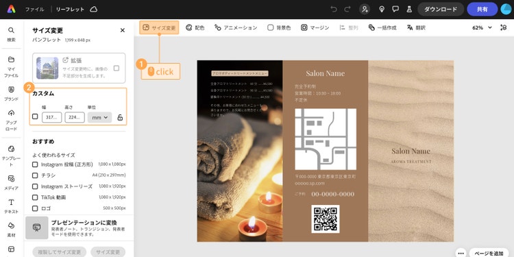 なお、画面左上の「サイズ変更」から、テンプレートのサイズが作りたいリーフレットのサイズと合っているかを確認しておくと安心です。 もしサイズを変更したい場合は、プレミアムプラン(有料プラン)を契約すると、テンプレートのサイズの変更が可能です。