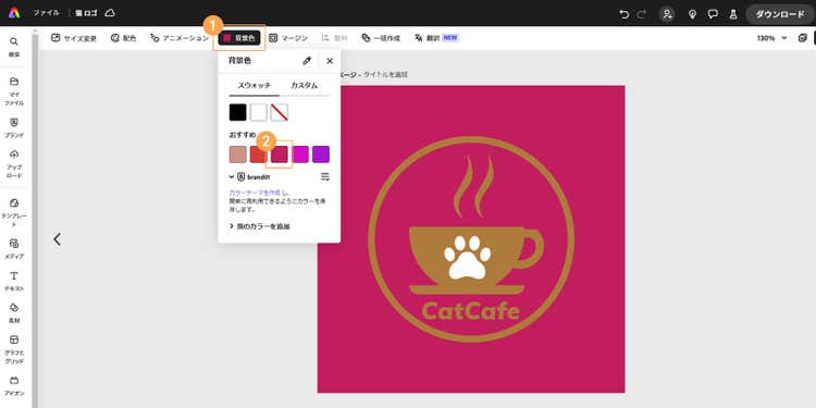 Adobe Expressを使えば、猫のロゴを活用した名刺やチラシを手軽に作成できます。豊富に揃ったテンプレートにロゴを配置するだけで、洗練されたデザインが手軽に仕上がり、さらにテンプレートの配色やレイアウトを自由に調整することも可能です。