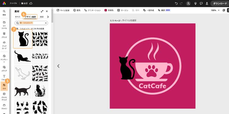 検索窓に「猫」「猫シルエット」などのキーワードを入力し、好みのモチーフを選択します。