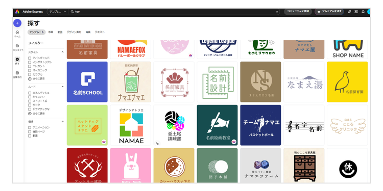 無料のデザインツール「Adobe Express」では、ロゴのテンプレートをたくさん見られます。