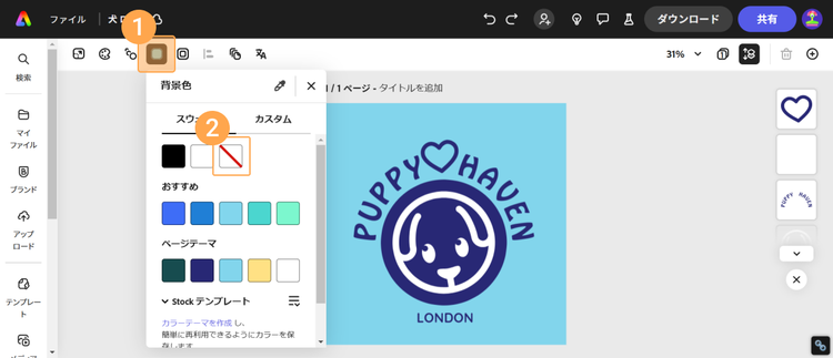 今回選択したテンプレートには背景に色が付いています。以下のキャプチャを参考に、背景色を透明にしましょう。背景を透明にすることで、どんなデザインにも自然に馴染むロゴを作成できます。