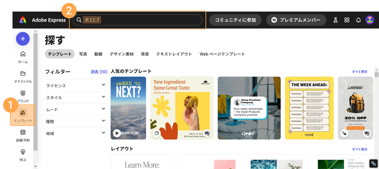 無料デザインツールのAdobe Expressでテンプレートを編集し、さっそく犬のロゴを作ってみましょう。ここではPCでの作成手順をご紹介しますが、アプリを使ってスマホやタブレットでデザインすることも可能です。