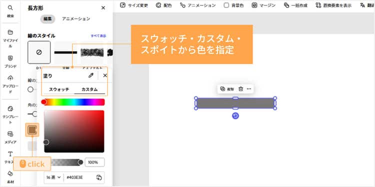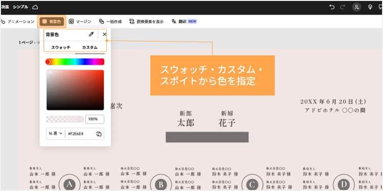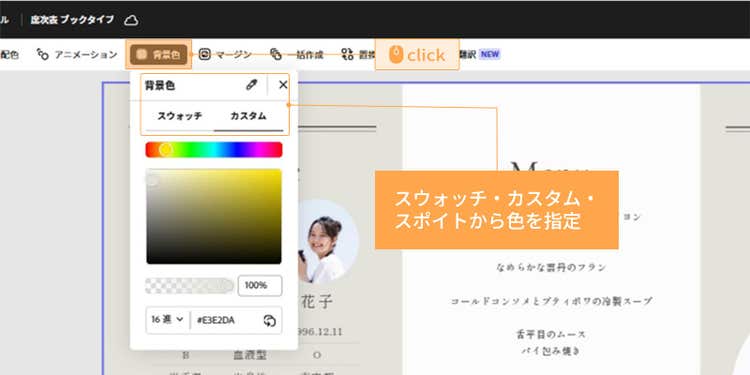 上部の「背景色」をクリックします。「スウォッチ」や「カスタム」から色を指定、または「スポイト」で画面上の色を抽出して変更しましょう。