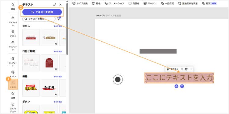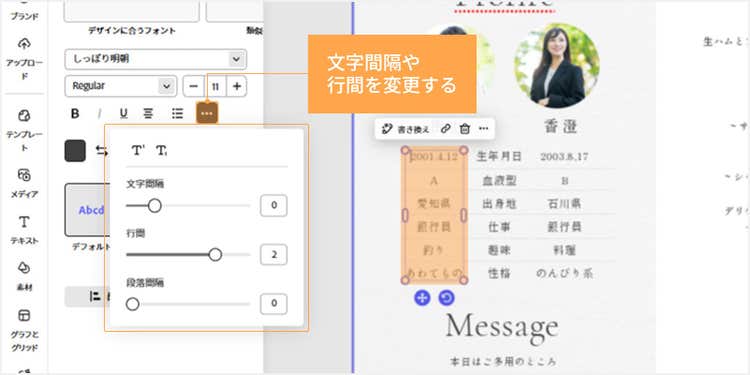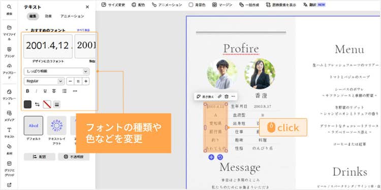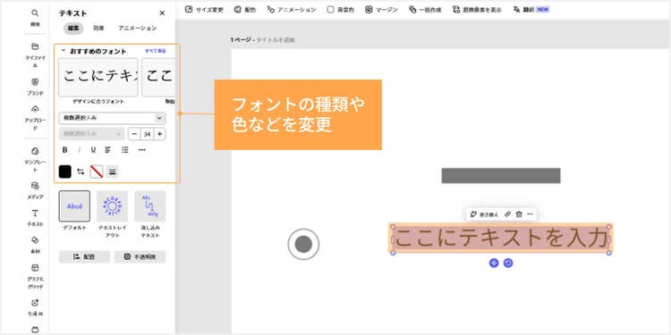 ツールバーからはフォントの種類や色、大きさなどの変更が可能です。テンプレートの雰囲気に合う「おすすめのフォント」も表示されるので、様々なフォントを試しながら、イメージにぴったりなものを選びましょう。
