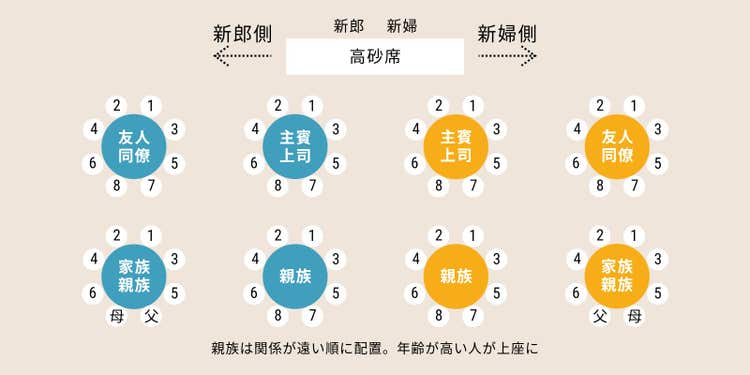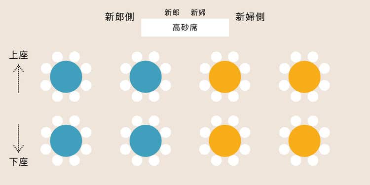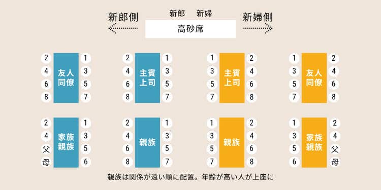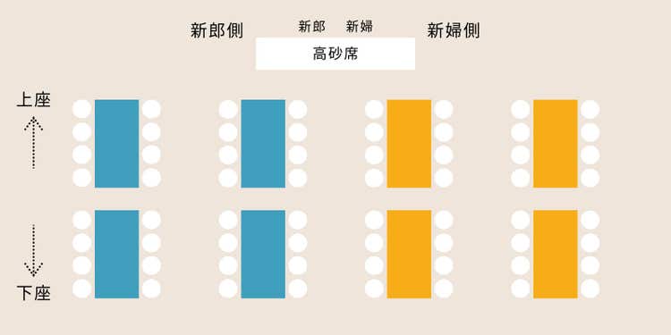 - 同じテーブル内でも、高砂席に近い席が上座です
