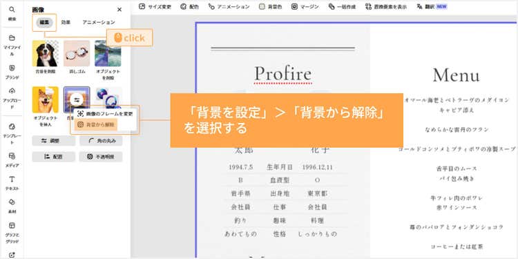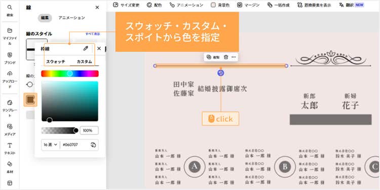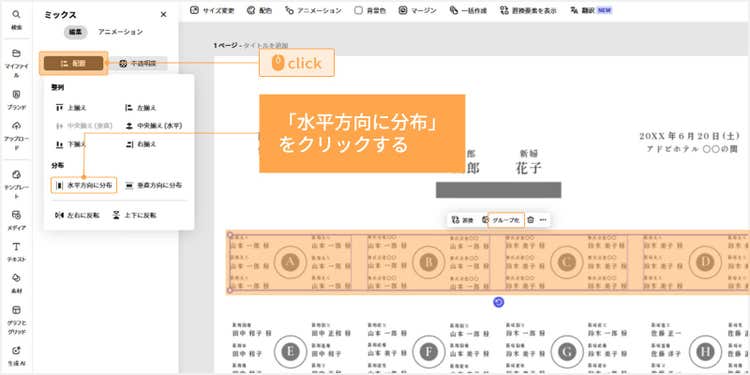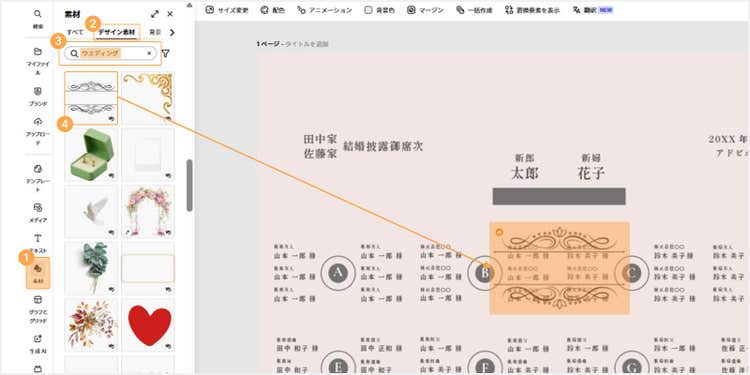 テンプレートを使えば、画像やテキストを変更するだけで、手軽に魅力的な席次表が完成します。ここではPCで作成する手順をご紹介しますが、アプリを使ってスマホやタブレットでデザインすることも可能です。