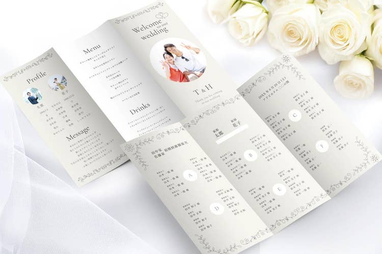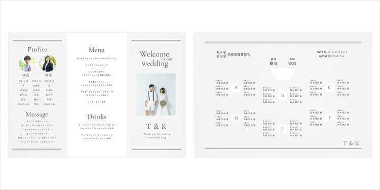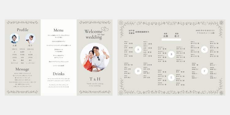 レイアウトの調整や画像・テキストの差し替えだけで、ふたりらしいオリジナルの席次表が手軽に仕上がります。