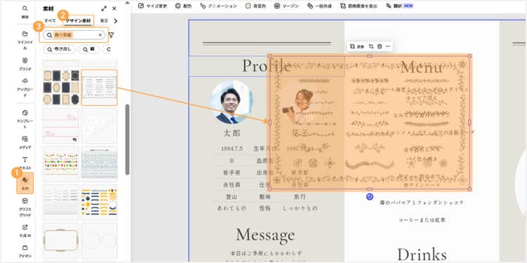 今回は「デザイン素材」を選択し、「飾り罫線」を検索しました。気に入ったものをクリックすると、自動的にカンバスに追加されます。