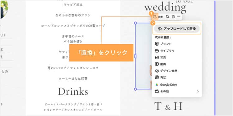 次に、テンプレート内の画像を変更しましょう。変更したい画像を選択し、「置換」>「アップロードして置換」をクリックし、PCに保存されている画像を選びます。