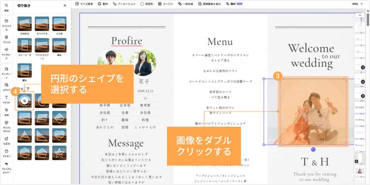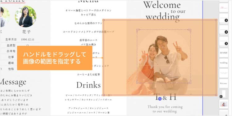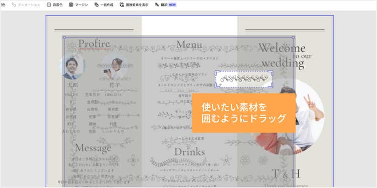 結婚式にぴったりのテンプレートや装飾素材が豊富に揃っており、レイアウトの調整も自在自在。