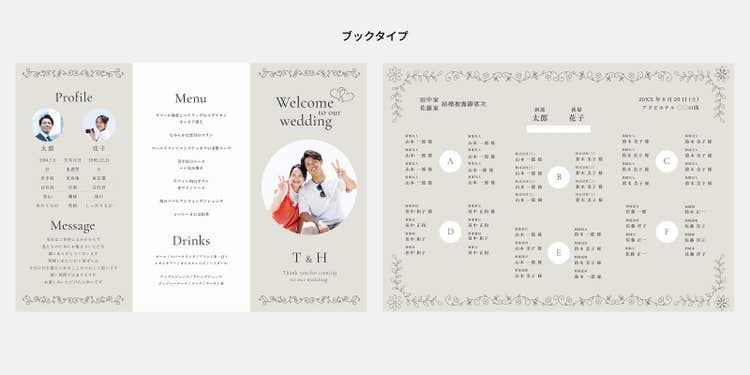ブックタイプは、披露宴の進行や新郎新婦のプロフィールなど、複数の情報をひとつにまとめて伝える形式です。 掲載する内容が多いため、構成を工夫して読みやすく仕上げることがポイント。