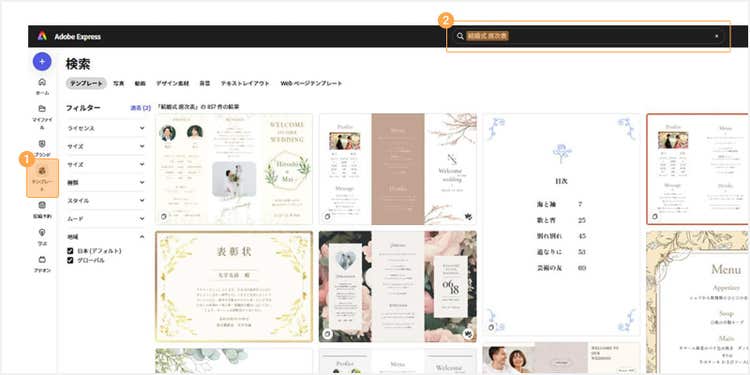 Adobe Expressには、ナチュラル系やクラシカル系など、結婚式の雰囲気に合ったテンプレートが豊富に揃っています。指輪や花など、結婚式らしいモチーフのイラストやアイコンも充実。