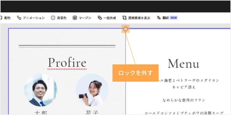 背景を変更して、披露宴のイメージに合う雰囲気や好みの色に変えてみましょう。まず、画像にロックがかかっている場合はクリックして解除します。