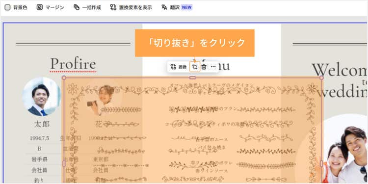 カンバス上で素材を選択して「切り抜き」>「自由形式」をクリックしましょう。