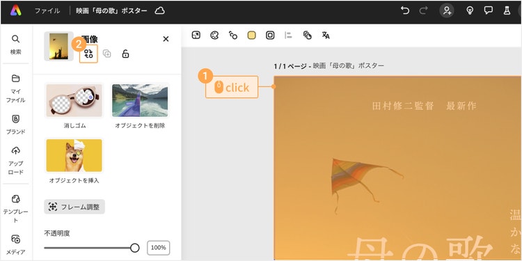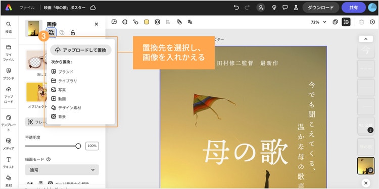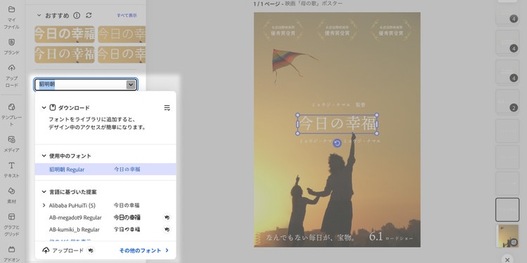 実際に映画のポスターを作成する場合には、メインビジュアルの画像を入れ替えてデザインするケースがほとんどでしょう。一方で、Adobe Expressのテンプレートはある程度構図ができあがっているため、フォントや素材の配置をサッと調整して、最後に画像だけを入れ替えるといった制作スタイルも可能です。