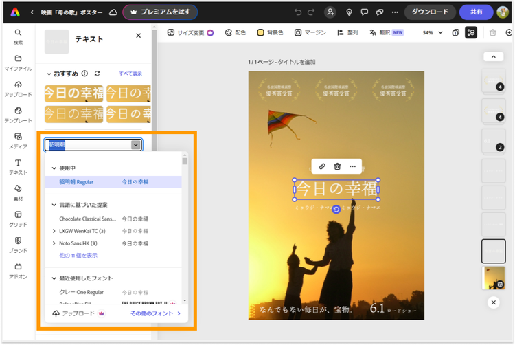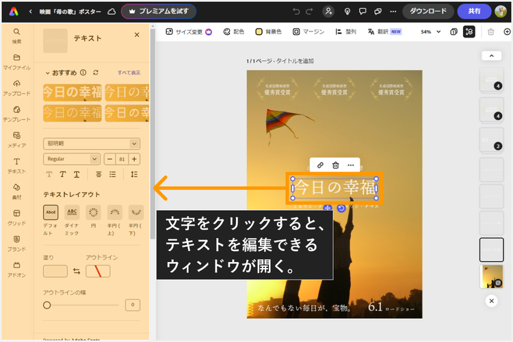 画面左側にテキストを編集できるウィンドウが開くので、テキストやフォントを変更しましょう。フォントメニューからは、Adobe Express内の豊富なフォントを使えます。