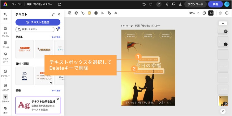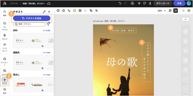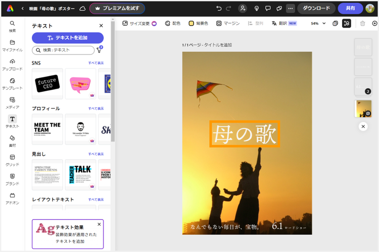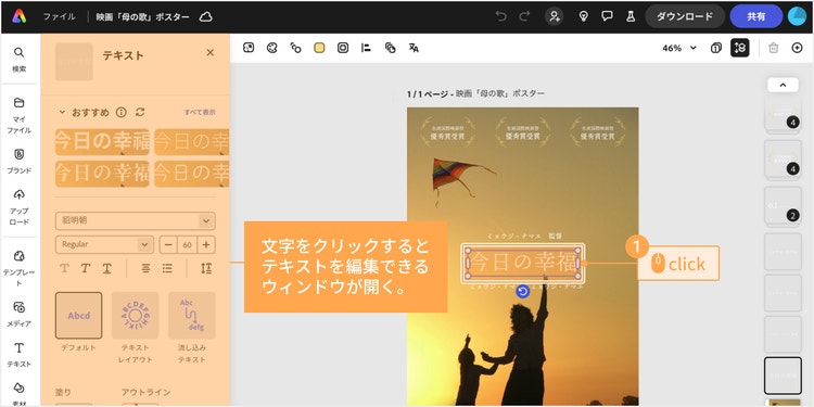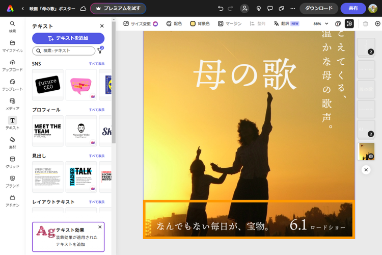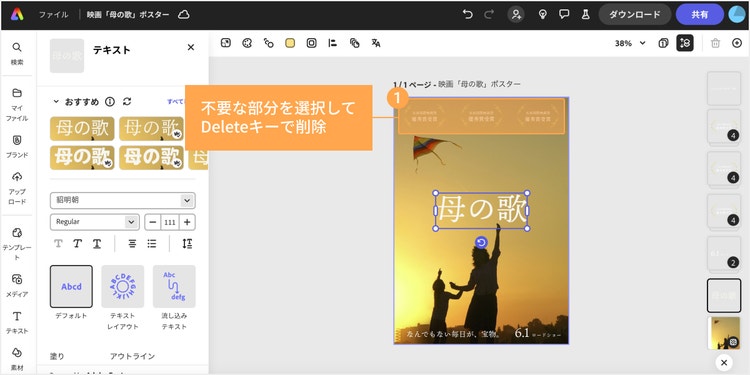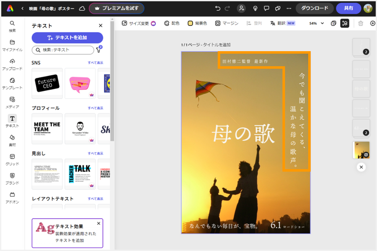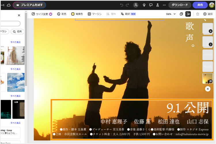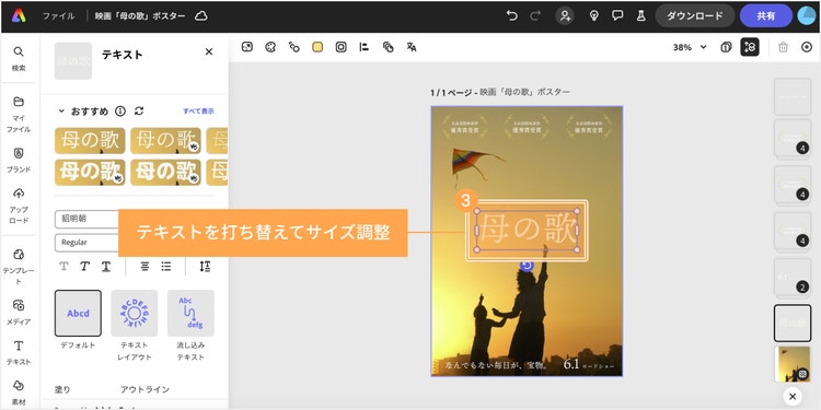 また、キャッチコピーの文言や見出しのサイズなど変更し、見栄えをさらにブラッシュアップしていきます。今回はテンプレート上部の受賞情報を削除し、その位置に監督名のテキストを挿入。そして画面右側にはキャッチコピーを置きました。