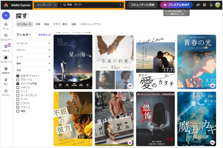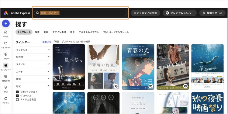 チラシのテンプレートを選択しましょう。画面上部にある検索窓に「映画 ポスター」と入力して検索します。Adobe Expressはテンプレートが豊富で、様々なジャンルのポスターがあるので、お好みのものがすぐ見つかるはずです。