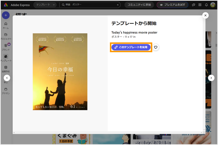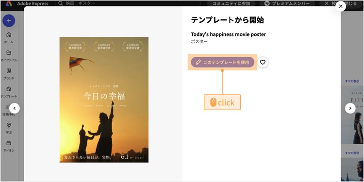 それでは、映画のポスターを作成してみましょう。ここからはPCブラウザ版のAdobe Expressを使って、ポスターの作り方を解説します。