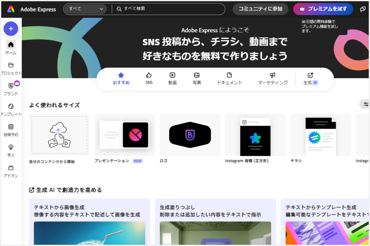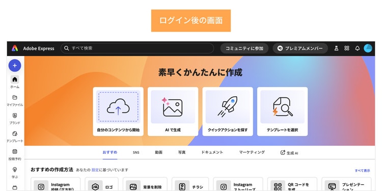 まずはPCのブラウザでAdobe Expressにアクセスし、GoogleアカウントやSNSアカウント、メールアドレスを使って無料ログインしてください。登録は30秒ほどで完了します。