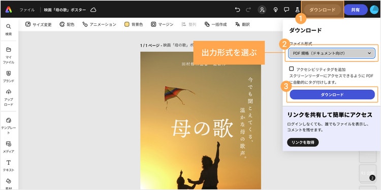 編集画面の上部にあるダウンロードボタンをクリックすると、ダウンロードメニューが開きます。出力形式を選び、紫色のダウンロードボタンをクリックして完了です。ちなみに、ポスターを印刷する場合は、表示崩れの少ないPDF形式を選ぶのがおすすめです。