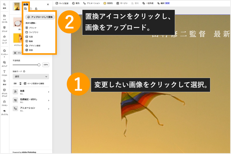 ちなみに、今回はテンプレートの画像をそのまま使用しましたが、背景や素材画像の入れ替えなども自由にできます。手順は以下の画像のとおりです。