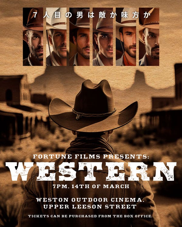 そして、テンプレートに無いオリジナル要素として、背中で語る強い人物を表現する素材を生成AI機能で作成し、ポスターに配置しました。また、日本版映画ポスターに見られる、人物の顔を強調するスタイルを取り入れ、上部に6人のカウボーイを配置しています。