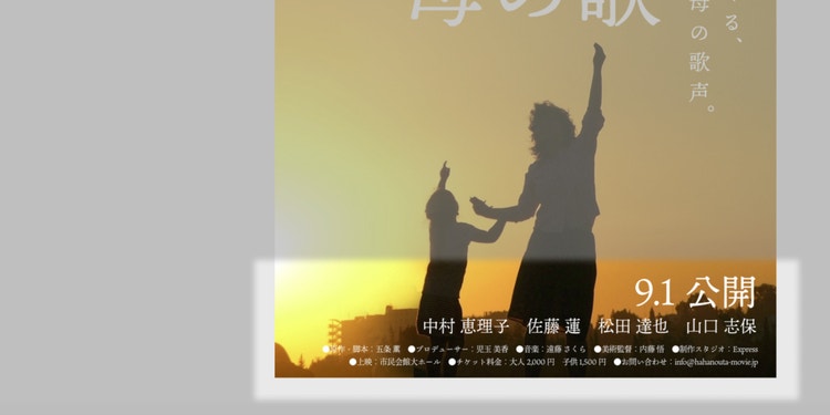 その次にメインキャストの名前を中程度のサイズで設置し、制作情報などは、それよりもさらに小さい文字で並べます。一般的な映画のポスターにはチケット料金などは記載されないケースが多いですが、今回は市で制作した映画ということで、ポスター内に料金情報も含めました。