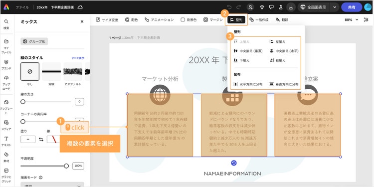 例えばAdobe Expressでは、複数の要素を選択したときに表示される整列パネルを使えば、要素を素早く整列させられます。