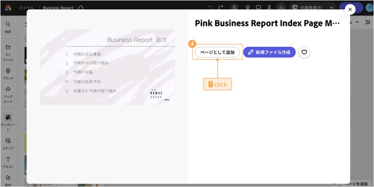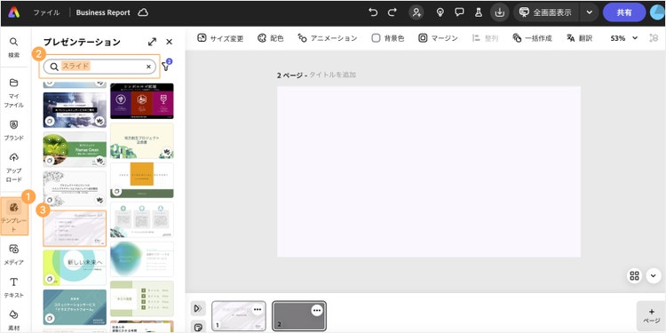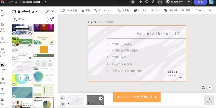 テンプレートを追加する場合は、1ページ目に選んだテンプレートと同じデザインのテンプレートを選ぶと、デザインを統一しやすくなります。上記の方法で、ページもしくはテンプレートを追加し、スライドの作成を進めましょう。