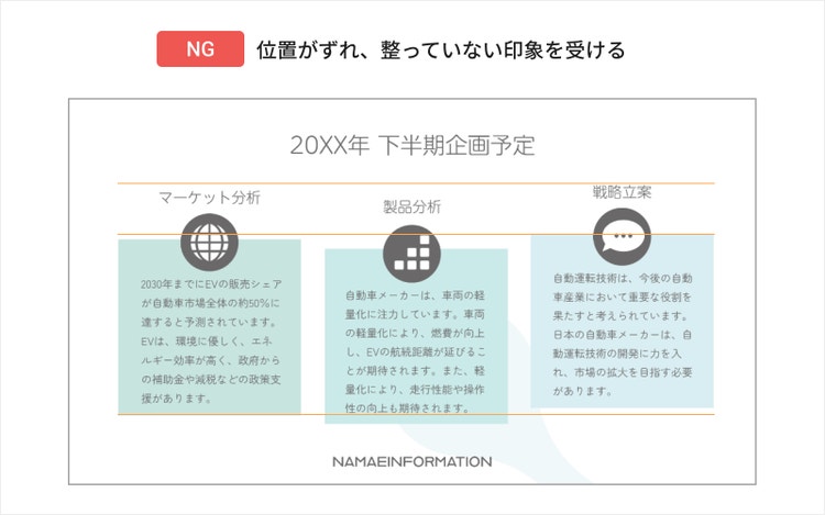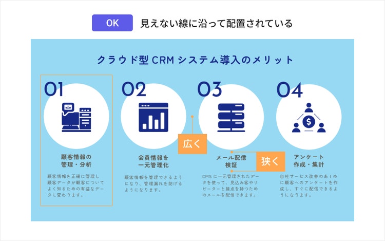 要素の「整列」については、少しのズレでも雑然とした印象を与えてしまうので、資料作成に使用するツールに付いている機能を使って、要素を整列させると安心です。