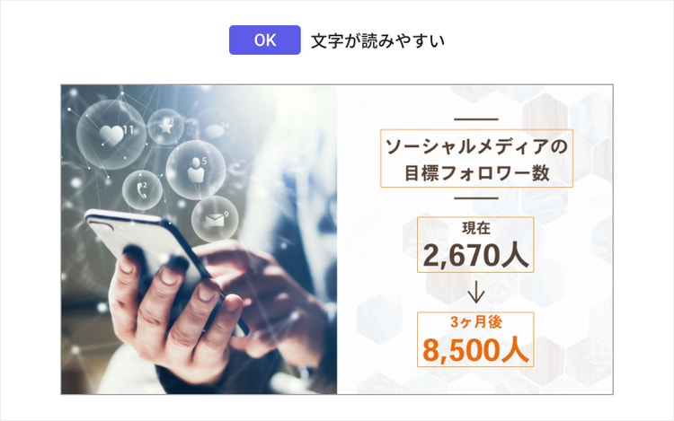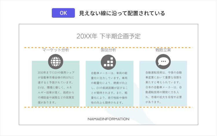 一方、以下のOK例では、要素の上下の位置が揃っており、整頓された印象を受けます。きれいに横並びになっていることで、3項目が並列関係にあることもわかりやすくなっています。