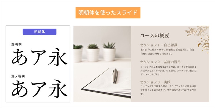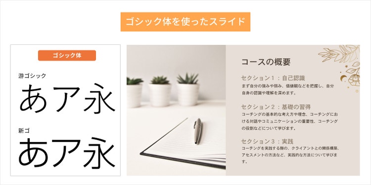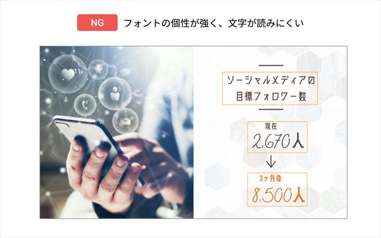 おしゃれなスライドを作りたいからといって、装飾的なフォントを使うと、文字を認識しづらくなり、情報が伝わりにくくなります。例えば、英語の筆記体や日本語のポップ体などは、読みにくいだけでなく、フォントの個性が強く全体のデザインとトーンをあわせにくいことも多いです。