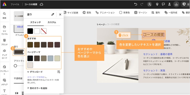 なお、色を決めるのが難しい場合は、Adobe Expressの「塗り」>「スウォッチ」から色を選ぶのがオススメです。「おすすめ」や「ページテーマ」でデザインに合う色を提案してくれるので、カンタンに統一感をもたせやすくなります 。