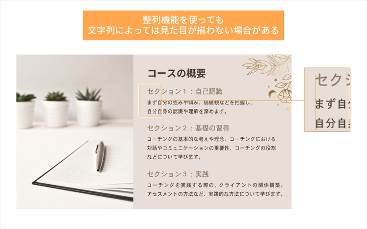 ちなみに、以下のスライドは、整列機能を使ってテキストを左揃えに整列しているにも関わらず、「セクション」の見出しのみわずかに右にズレているように見えます。