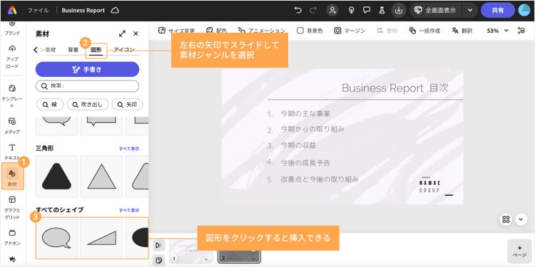 情報量が多いときは、丸や四角などの図形を使って図解を作ると、一目で内容が伝わりやすくなります。図形は、 画面左側のメニューの「素材」>「図形」をクリックし、好みの図形をクリックすると挿入できます。