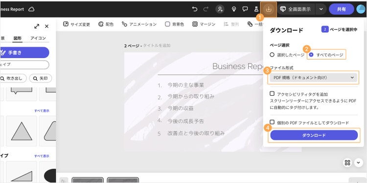 スライドの全ページをPDFでダウンロードするには、画面右上の「ダウンロード」をクリック→「すべてのページ」と「PDF」を選び、「ダウンロードを開始」をクリックしてください。