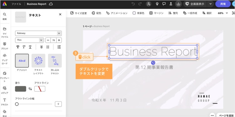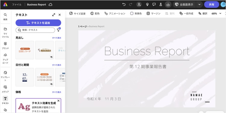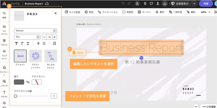 テンプレートの文字を変更したいときは、変更したい箇所の文字をクリックしてください。すると、面左側に「テキスト」のウィンドウが開くので、テキストの内容やフォント、文字色を変更してください。