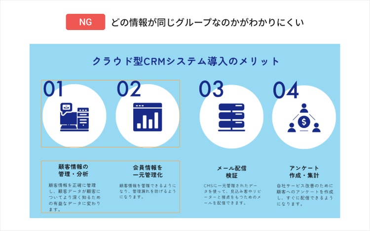 例えば以下のNG例では、中央の間隔が広いので、「01」と「02」、「03」と「04」がそれぞれ異なるグループを作っているように見えます。さらに、見出しや本文がアイコンから離れており、アイコンとは関係がない情報だと勘違いされる可能性があります。