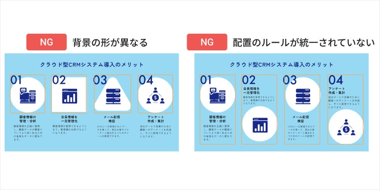 例えば、以下の左のスライドのようにアイコンの背景の図形が異なっていたり、右のスライドのように要素の配置ルールが統一されていなかったりすると、4項目が異なる種類の情報だと誤解されやすくなります。