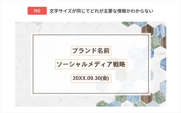 例えば、以下スライドのように文字サイズがすべて同じ場合、情報の優先度が同じに見えてしまい、どれがタイトルなのかがわからなくなります。