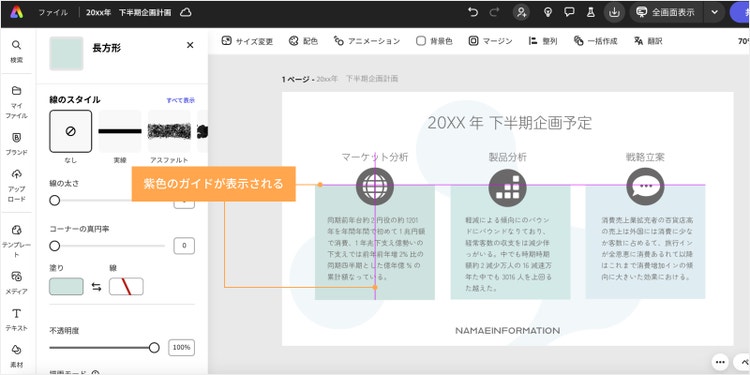 また、同じライン上に要素が揃うと点線のガイドが表示されるので、ガイドを見ながら調整することも可能です。