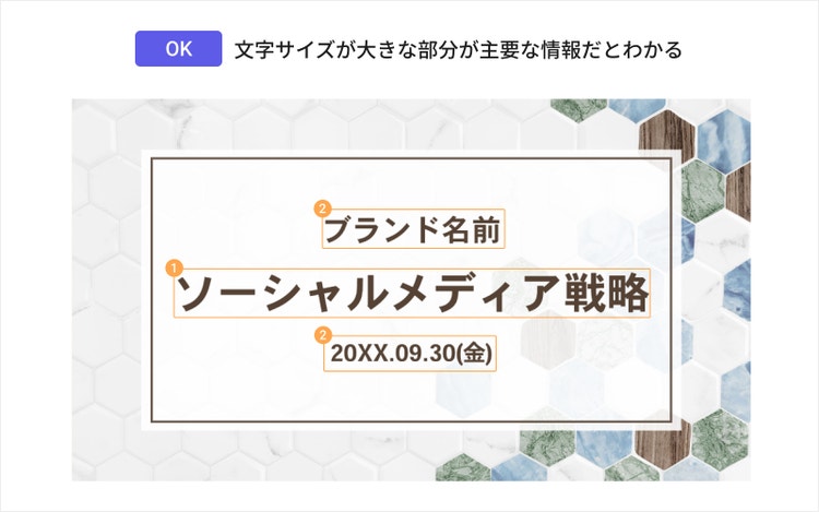 「対比」とは、目立たせたい部分の要素の大きさや色のみを変え、強弱を付けることです。特に複数の要素がある場合に、強調したいポイントが相手に一目で伝わりやすくなります。