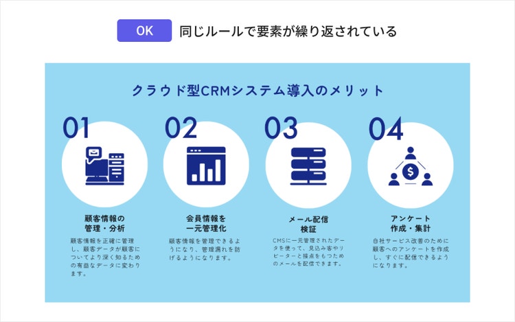 「反復」とは、視覚的な特徴を繰り返し用いることです。同じ特徴をもつ情報が並列関係にあることを示したり、デザインに統一感をもたせられたりするメリットがあります。